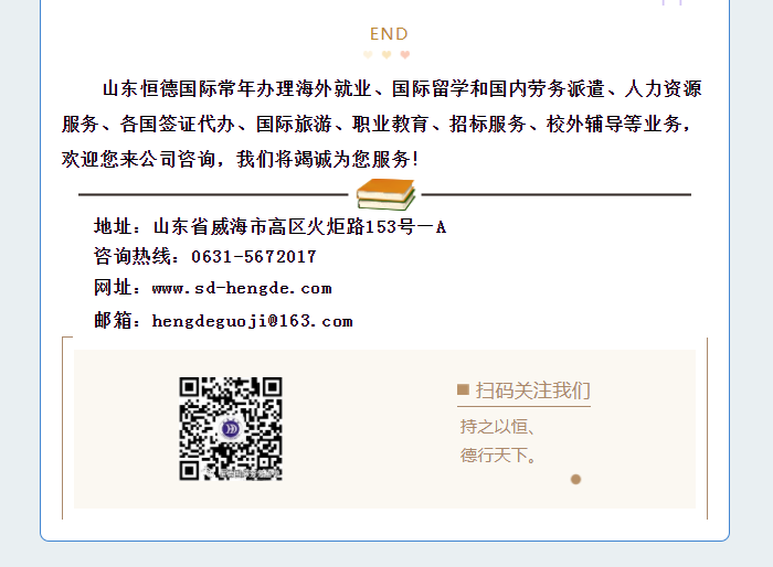 版權所有:山東恒德國際經濟技術合作有限公司 威海恒德職業培訓學校 地址:威海市高區火炬路153號-A 免費熱線:4006150009電話:(韓國部)+86-631-5672008(日本部)+86-631-5672006 (新加坡)+86-631-5672009 (留學部)+86-631-5672011 傳真:+86-631-5672028 郵 編:264209 郵箱:hengdeguoji@163.com51La| 策劃制作:威海雷迅網絡 魯ICP備19060589號 魯公網安備 37100302000191號